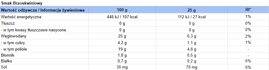 Składniki: brzoskwinie 60%, substancje słodzące: (erytrytol, ksylitol, glikozydy stewiolowe), woda, substancja żelująca - pektyna, regulator kwasowości: kwas cytrynowy, przeciwutleniacz - kwas askorbinowy.