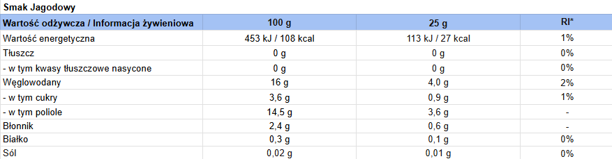 Składniki: owoce leśne 60%, substancje słodzące: (erytrytol, ksylitol, glikozydy stewiolowe), substancja żelująca - pektyna, regulator kwasowości: kwas cytrynowy.