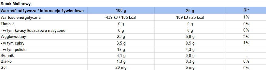 Składniki: maliny 60%, substancje słodzące: (erytrytol, ksylitol, glikozydy stewiolowe), woda, substancja żelująca - pektyna, regulator kwasowości: kwas cytrynowy.
