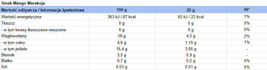 Składniki: mango (30%) i marakuja (30%), substancje słodzące: (erytrytol, ksylitol, glikozydy stewiolowe), substancja żelująca - pektyna, regulator kwasowości: kwas cytrynowy.