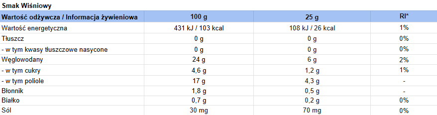Składniki: wiśnie 60%, substancje słodzące: (erytrytol, ksylitol, glikozydy stewiolowe), woda, substancja żelująca - pektyna, regulator kwasowości: kwas cytrynowy.