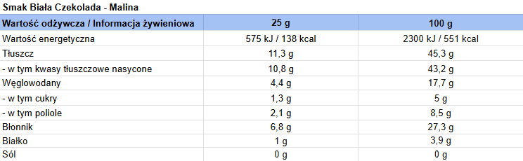 Składniki: miąższ kokosowy, inulina, erytrytol, olej MCT (2,7%), liofilizowane maliny (2%), błonnik grochowy, naturalny aromat białej czekolady.