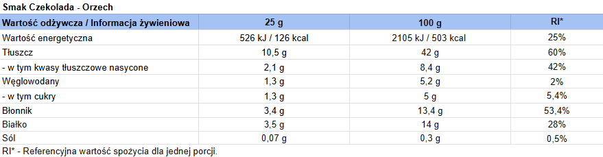 Składniki: olej kokosowy, orzechy laskowe (15,9%), białko serwatkowe w proszku, pełnotłuste mleko w proszku, erytrytol, pełnotłuste kakao w proszku (8,2%), inulina, olej słonecznikowy, lecytyna słonecznikowa, ekstrakt ze stewii, aromat waniliowy.