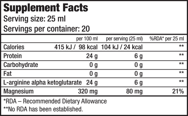 Główny składnik aktywny suplementu diety AAKG Shock Extreme ma postać płynnej alfa-ketoglutaran L-argininy. Produkt został wzbogacony o magnez. Jedna porcja preparatu dostarcza aż 6000 mg argininy!