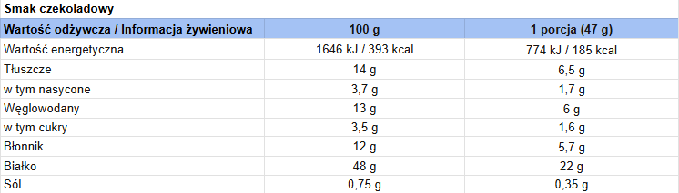 Składniki: mieszanka białek [mleko] (koncentrat białka serwatkowego, izolat białka serwatkowego, kazeinian wapnia, kazeina micelarna, izolat białka mleka, emulgator: lecytyna sojowa), albumina jaj, olej z suszonego słonecznika [mleko], zagęszczacze (polidekstroza, karboksymetyloceluloza sodu), niskotłuszczowe kakao w proszku, aromaty [mleko], suszone trójglicerydy średniego łańcucha [mleko], chlorek sodu, słodziki (sukraloza, acesulfam potasu), hydrolizowane białko pszenne.