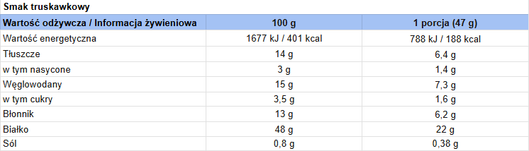 Składniki: mieszanka białek [mleko] (koncentrat białka serwatkowego, izolat białka serwatkowego, kazeinian wapnia, kazeina micelarna, izolat białka mleka, emulgator: lecytyna sojowa), albumina JAJ, olej z suszonego słonecznika [mleko], zagęszczacze (polidekstroza, karboksymetyloceluloza sodu), aromaty, suszone trójglicerydy średniego łańcucha [mleko], chlorek sodu, barwnik (czerwień buraczana), słodziki (sukraloza, acesulfam potasu), hydrolizowane białko pszenne.