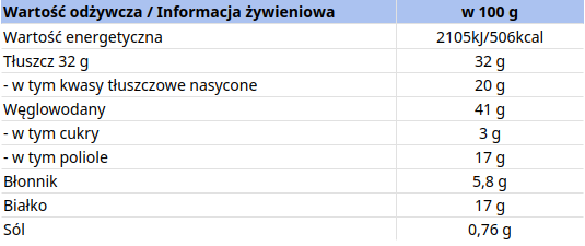 Produkt może zawierać orzechy, jaja, nasiona sezamu, soję i produkty pochodne.