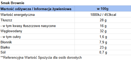 Składniki: Białka mleka 25 %, czekolada 12 % (substancja słodząca: maltitole; miazga kakaowa, emulgator: lecytyny (z soi); kakao o obniżonej zawartości tłuszczu, naturalny aromat waniliowy), masło klarowane (Ghee) (mleko), nieutwardzony tłuszcz palmowy, substancja utrzymująca wilgoć: glicerol; substancja słodząca: maltitole; błonnik rozpuszczalny (kukurydziany), skrobia kukurydziana, izolat sojowy, kakao o obniżonej zawartości tłuszczu, błonnik rozpuszczalny (akacjowy), skrobia z tapioki, sól morska, sól, aromaty, substancja spulchniająca: węglany sodu; emulgator: lecytyny (z soi); substancja słodząca: sukraloza.