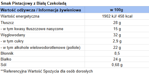 Składniki: Białka mleka 25,4 %, masło klarowane (Ghee) (mleko), nieutwardzony tłuszcz palmowy, substancja utrzymująca wilgoć: glicerol; substancja słodząca: maltitole; rozpuszczalny błonnik kukurydziany, skrobia kukurydziana, czekolada biała 5,5 % (substancja słodząca: maltitole; tłuszcz kakaowy, mleko w proszku pełne, emulgator: lecytyny; naturalny aromat waniliowy), pistacje 4 %, błonnik rozpuszczalny (akacjowy), izolat sojowy, skrobia z tapioki, substancja spulchniająca: węglany sodu; sól, aromat, sól morska, emulgator: lecytyny (z soi), substancja słodząca: sukraloza.