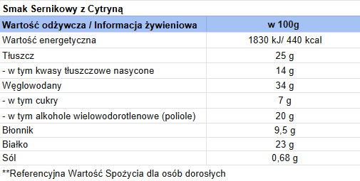Składniki: Białka mleka 24,9 %, masło klarowane (Ghee) (mleko), nieutwardzony tłuszcz palmowy, substancja utrzymująca wilgoć: glicerol; substancja słodząca: maltitole; rozpuszczalny błonnik kukurydziany, skrobia kukurydziana, kostki żelowe cytrynowe 4,5 % (skoncentrowane puree jabłkowe, skoncentrowany sok jabłkowy, skoncentrowany sok cytrynowy 6,1 %, błonnik cytrusowy, substancja żelująca: pektyna; naturalny aromat cytrynowy, naturalny aromat limonkowy), morela suszona (morela, mąka ryżowa); błonnik rozpuszczalny (akacjowy), izolat sojowy, ser w proszku (z mleka) 0,5 %, serwatka w proszku (z mleka), skrobia z tapioki, aromaty, substancja spulchniająca: węglany sodu; sól, sól morska, emulgator: lecytyny (z soi), cynamon, substancja słodząca: sukraloza.