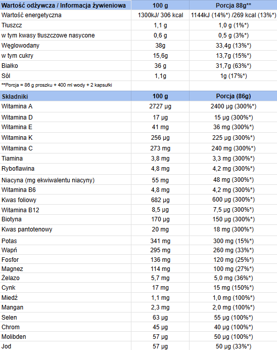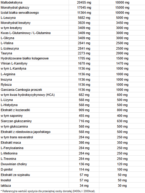 Składniki PROSZKU: Maltodekstryna, monohydrat dekstrozy, izolat białka serwatkowego, L-leucyna, monohydrat kreatyny, L-glutamina, glicyna, L-izoleucyna, L-walina, regulator kwasowości: kwas jabłkowy, kwas cytrynowy, aromat, tauryna, cytrynian sodu, hydrolizowane białko kolagenowe (wołowe), winian L-karnityny, chlorowodorek L-argininy, D-ryboza, inozyna, ekstrakt z Garcinia Cambogia (owoc), kompleks glukozaminy z chlorkiem potasu (z muszli skorupiaków), sole wapniowe kwasu ortofosforowego, sole magnezowe kwasu cytrynowego, mieszanina witamin (witamina C, niacyna, witamina E, kwas pantotenowy, tiamina, ryboflawina, witamina B6, witamina A, kwas foliowy, D-biotyna, witamina K, witamina D3, witamina B12, witamina K1), cytrynian potasu , chlorowodorek L-histydyny, chlorowodorek L-lizyny, średniołańcuchowe trójglicerydy (MCT) z oleju kokosowego i palmowego, L-fenyloalanina, L-metionina, L-treonina, substancja słodząca (sukraloza), dwuwinian choliny, D-pinitol, inozytol, emulgator (lecytyny sojowe), cytrynian cynku, laktaza (Aspergillus Orysae), difosforan żelaza, barwnik (beta karoten (dla smaku pomarańczowego i tropical punch), ekstrakt z karminu (dla smaku wiśniowego)), siarczan manganu, siarczan miedzi, chlorek chromu, sód selenian, molibdenian sodu, jodek sodu.