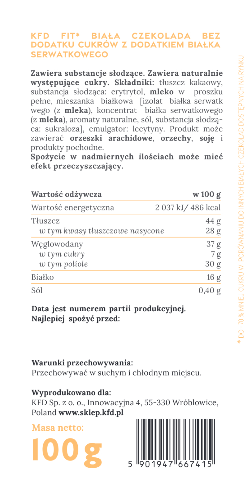 KFD Fit Biała Czekolada z dodatkiem białka to "odchudzona" (bez, między innymi, dodanego cukru (sacharozy)) wersja znanej i lubianej białej czekolady.