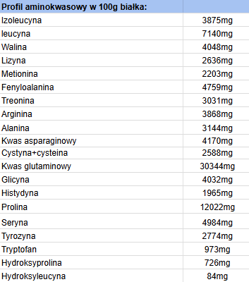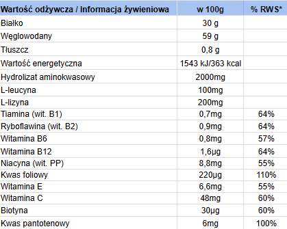 Składniki: kompleks serwatkowy 737 (suszona serwatka, koncentrat białek serwatki WPC, izolat białek serwatki WPI, hydrolizat białek serwatki WPH), białko zarodków pszenicy, maltodekstryna, kompleks peptydowo-aminokwasowy 737 (hydrolizat białka kolagenu, hydrolizat białek serwatki, l-leucyna, l-lizyna), aromaty (smak na opakowaniu), witaminy (kwas l-asparaginowy [witamina C], nikotynamid [niacyna], D-alfa-tokoferol [witamina E], D-pantotenian wapnia [kwas pantotenowy], ryboflawina [witamina B2], chlorowodorek pirydoksyny [witamina B6], chlorowodorek tiaminy [witamina B1], l-metylofolian wapnia [foliany], D-biotyna [biotyna], cyjanokobalamina [witamina B12], barwnik E129 dla smaku truskawkowego i malinowego.