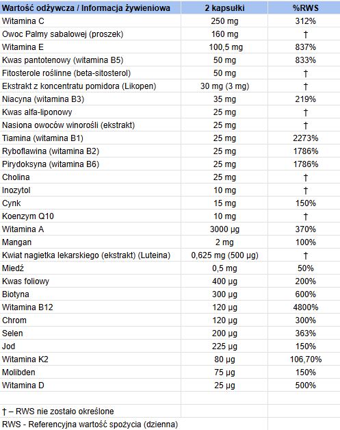 Składniki: Witamina C – askorbinian wapnia; owoc palmy sabalowej (Serenoa repens) proszek; witamina E- D-alfa-tokoferol; D-pantotenian wapnia; cytrynian wapnia; kwas α-liponowy; sok aloesu zwyczajnego (Aloe vera Succus) proszek; amid kwasu nikotynowego; chlorowodorek tiaminy; ryboflawina; chlorowodorek pirydoksyny, pirydoksalo-5-fosforan; cytrynian magnezu; chlorek potasu; dwuwinian choliny; nasiona owoców winorośli (Vitis vinifera Semen) extrakt (DER 12:1, 95% polifenoli); L-pidolan cynku; koenzym Q10 (ubichinon); ekstrakt koncentratu pomidora (Lycopersicon esculentum) (DER 1053:1, 10% likopenu); beta karoten, palmitynian retinolu; diglicynian manganu; kwiat nagietka lekarskiego (Calendula officinalis Flos) ekstrakt (DER 2265:1, 80% luteiny); diglicynian miedzi; kwas pteroilomonoglutaminowy; D-biotyna; witamina B12 – cyjanokobalamina, metylokobalamina; pikolinian chromu; L-selenometionina; jodek potasu; witaminy K (jako K2): menachinon; molibdenian (VI) sodu; cholekalcyferol; subst. wypełniająca: celuloza mikrokrystaliczna; materiał kapsułki: żelatyna; subst. rozpuszczająca: gliceryna roślinna, woda; olej z pestek dyni; subst. glazurująca: wosk pszczeli; subst. emulgująca: lecytyna słonecznikowa; aromat: olejek cynamonowy (Cinnamonum cassia) (korzeń).