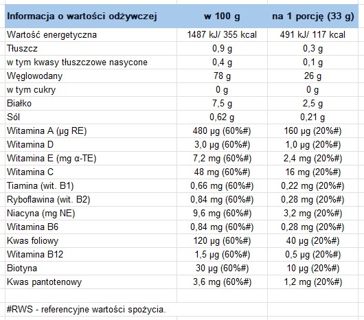 Składniki: 97% mąka ryzowa, aromaty, substancja przeciwzbrylająca – dwutlenek krzemu; sól, substancje słodzące – acesulfam K, sukraloza; witaminy [kwas L-askorbinowy – wit. C, octan DL-alfa-tokoferylu – wit. E, amid kwasu nikotynowego – niacyna, octan retinylu – wit. A, D-pantotenian wapnia – kwas pantotenowy, cyjanokobalamina – wit. B12, cholekalcyferol – wit. D, chlorowodorek pirydoksyny – wit. B6, ryboflawina – wit. B2, monoazotan tiaminy – tiamina (wit. B1), kwas pteroilomonoglutaminowy – kwas foliowy, D-biotyna – biotyna].