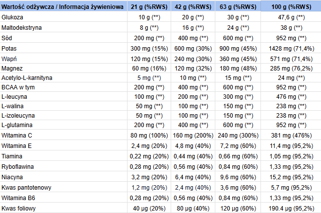 Składniki: glukoza, maltodekstryna, chlorek potasu, chlorek sodu, sole magnezowe kwasu cytrynowego, barwniki (karoteny dla smaku mango-marakuja, żółcień pomarańczowa dla smaku pomarańczowego, żółcień chinolinowa dla smaku cytrynowego, indygotyna dla smaku blueberry), L-glutamina, BCAA, węglan wapnia, premiks witaminowy: kwas L-askorbinowy, amid kwasu nikotynowego, D-alfa tokoferol, D-pantotenian wapnia, ryboflawina, chlorowodorek pirydoksyny, monoazotan tiaminy, kwas pteroilomonoglutaminowy, D-biotyna, cyjanokobalamina, aromat, acetylo-L-karnityna, substancja słodząca - sukraloza.