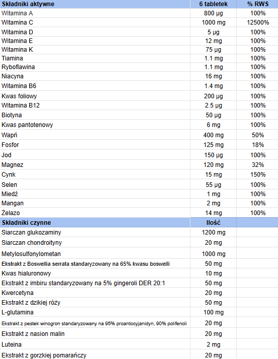 Składniki: substancja wypełniająca – celuloza, siarczan glukozaminy, metylosulfonylometan, cytrynian magnezu, kwas L-askorbinowy, skrobia ryżowa, węglan wapnia, substancja przeciwzbrylająca – sole magnezowe kwasów tłuszczowych, dwutlenek krzemu, L-glutamina, ekstrakt z kadzidłowca indyjskiego Boswelia serrata standaryzowany na 65% kwasu bosweliowego, ekstrakt dzikiej róży Rosa canina DER 4:1, ekstrakt z imbiru Zingiber officinale standaryzowany na 5% gingeroli DER 20:1, siarczan chondroityny, kwercetyna, ekstrakt z pestek winogron Vitis vinifera standaryzowany na 95% proantocyjanidyn, 90% polifenoli, ekstrakt z owoców malin Rubus idaeus standaryzowany na 5% ketonów malinowych, ekstrakt z owocu gorzkiej pomarańczy Citrus aurantium L., standaryzowany na 10% bioflawonoidów, mleczan żelaza, kwas hialuronowy, siarczan cynku, siarczan manganu, siarczan miedzi, D-pantotenian wapnia, luteina, amid kwasu nikotynowego, D-alfa-tokoferol, chlorowodorek pirydoksyny, monoazotan tiaminy, ryboflawina, octan retinylu, jodek potasu, selenin sodu, kwas pteroilomonoglutaminowy, fitomenadion, D-biotyna, cholekalcyferol, cyjanokobalamina.