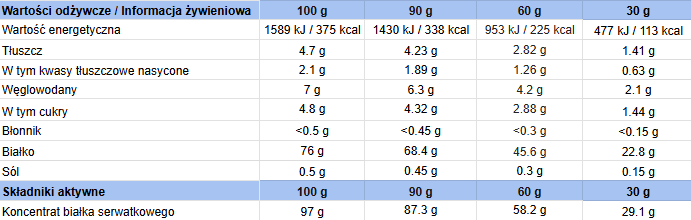 Składniki: koncentrat białek serwatki (z mleka), kakao (w smaku czekoladowym), aromat, kwas cytrynowy (w smaku truskawkowym), substancja zagęszczająca (sól sodowa karboksymetylocelulozy), substancja słodząca (sukraloza, acesulfam K), wyciąg z czarnej marchwi (dla smaku wanilia jagoda), wyciąg z czerwonego buraka (dla smaków: truskawkowy, wanilia jagoda, bananowo truskawkowy, kawowe ciasto z malinami, lody truskawkowe, biała czekolada-poziomka, jogurtowo wiśniowy), barwniki: (karoteny dla smaków: wanilia, wanilia migdał, banan, mango-banan, ciastko, biała czekolada ananas, cynamon, jabłko cynamon, bananowo truskawkowy, waniliowy serniczek, mascarpone ciasto cytrynowe, lody waniliowe, brzoskwinia; karmel amoniakalny dla smaków: karmelowy, czekolada, czekolada-orzech, kawowe ciasto z malinami, cynamon, jabłko cynamon, czekoladowo kremowe kruche ciastko, ciastko milionera, słony karmel, masło orzechowe, latte, mleko kondensowane).