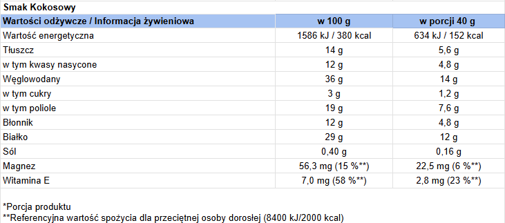 Składniki: 29 % mieszanka białek [białka mleka, izolat białka sojowego], substancja słodząca (maltitol), 20 % polewa kakaowa [tłuszcz palmowy, polidekstroza, białka mleka, 8 % kakao w proszku o obniżonej zawartości tłuszczu, emulgator (lecytyny), aromat, substancja słodząca (sukraloza)], substancja utrzymująca wilgoć (glicerol), błonnik z korzenia cykorii, 6 % mielony kokos, tłuszcz kokosowy, magnez (sole magnezowe kwasu cytrynowego), emulgator (lecytyny), sól, kwas (kwas mlekowy), aromat, witamina E (octan D-alfa-tokoferylu).